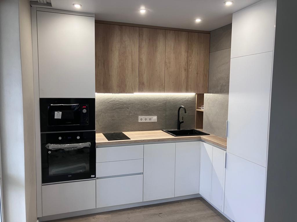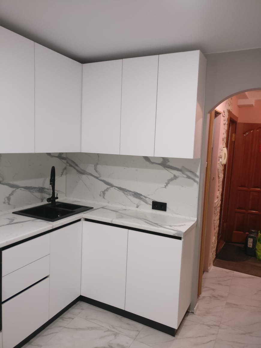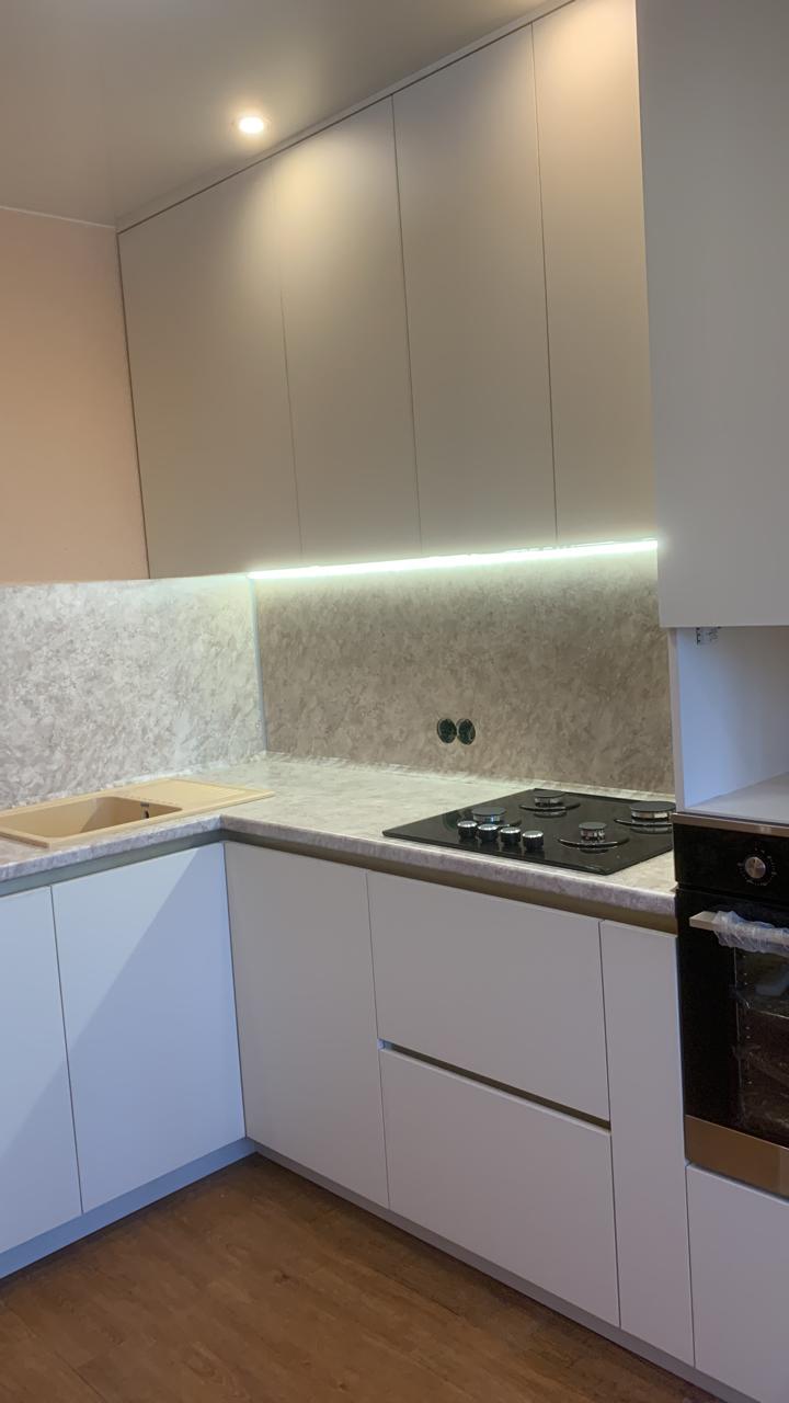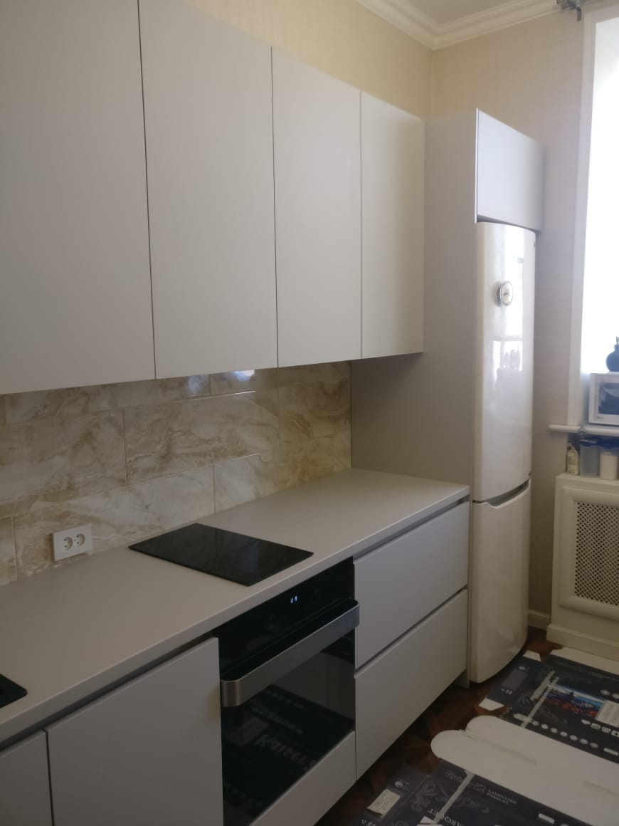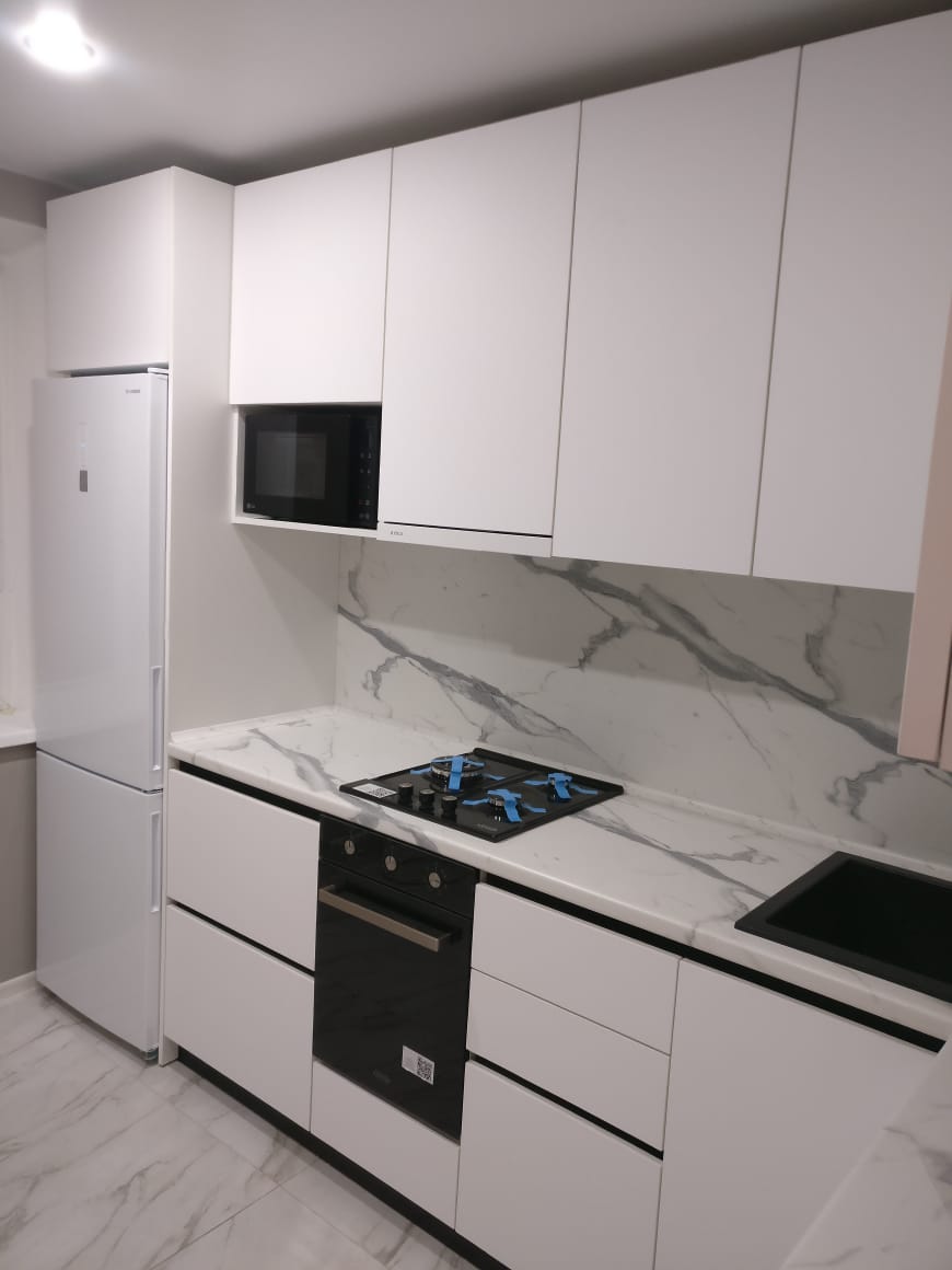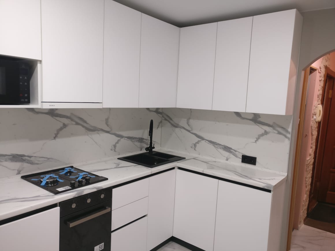 Современная кухня с белыми матовыми фасадами