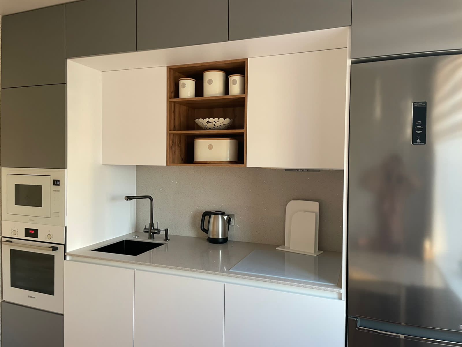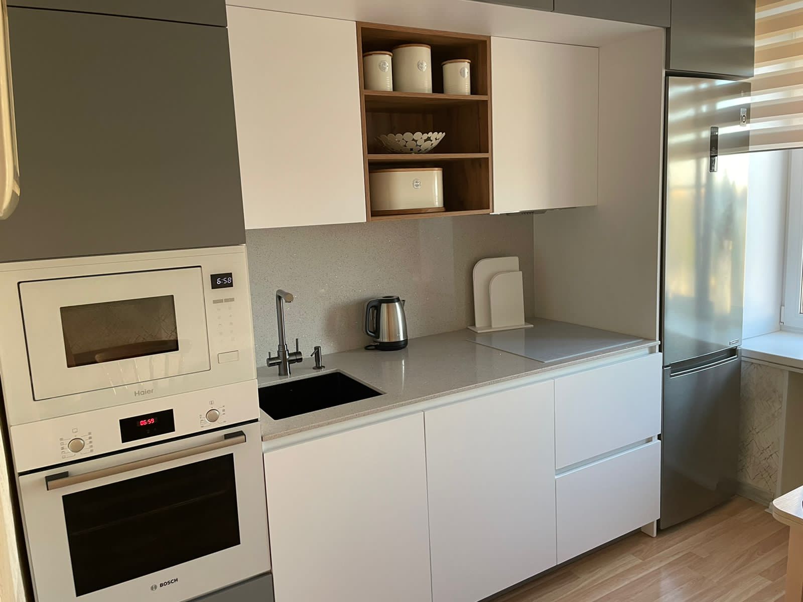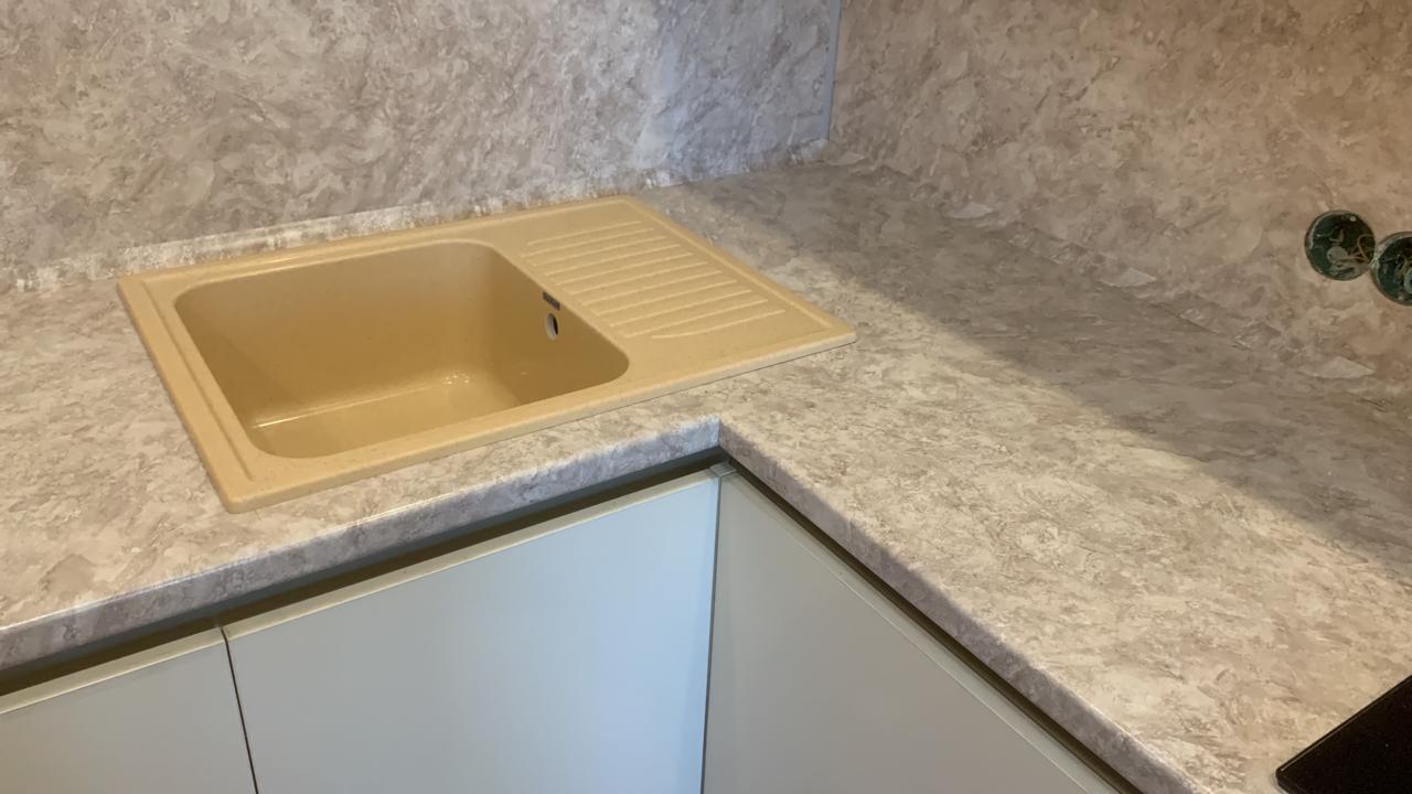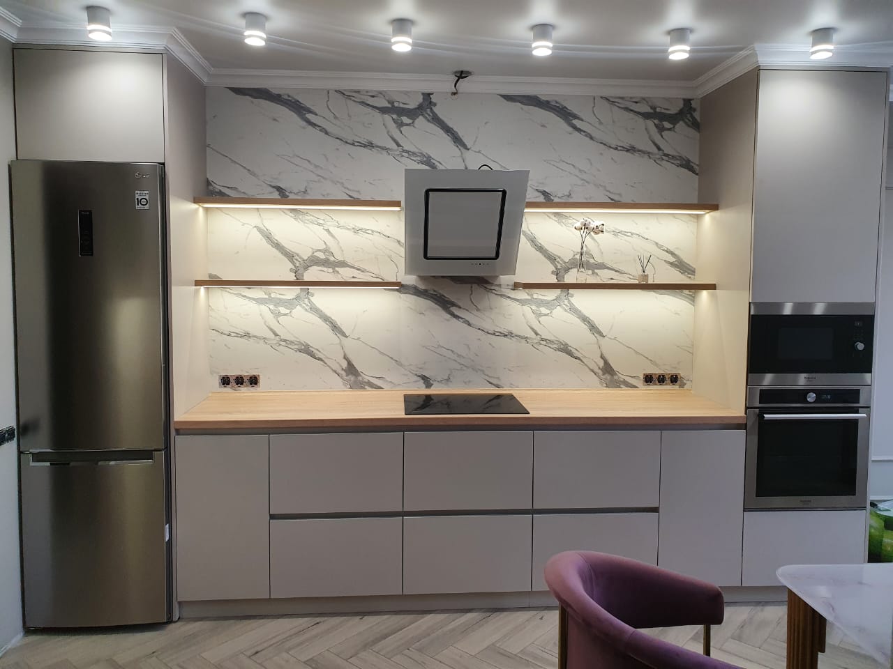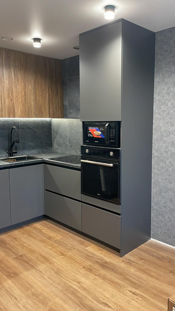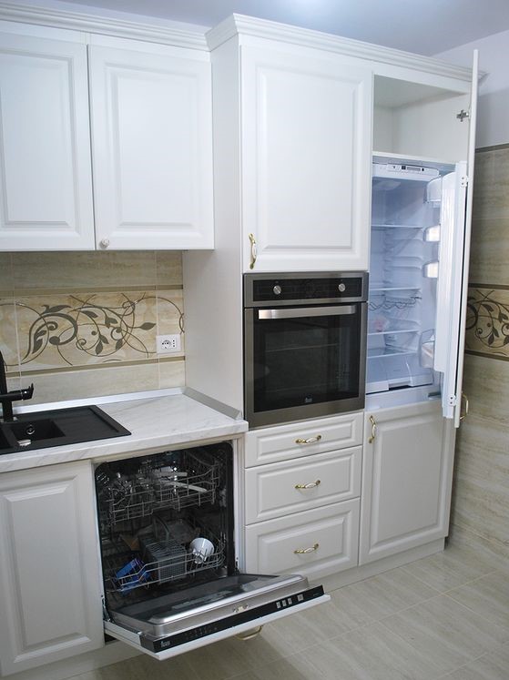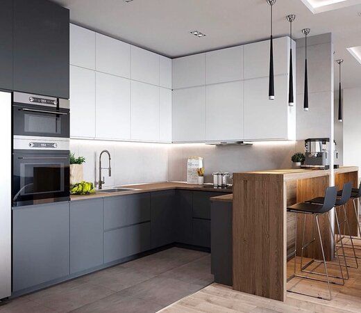 Современная кухня с белыми матовыми фасадами