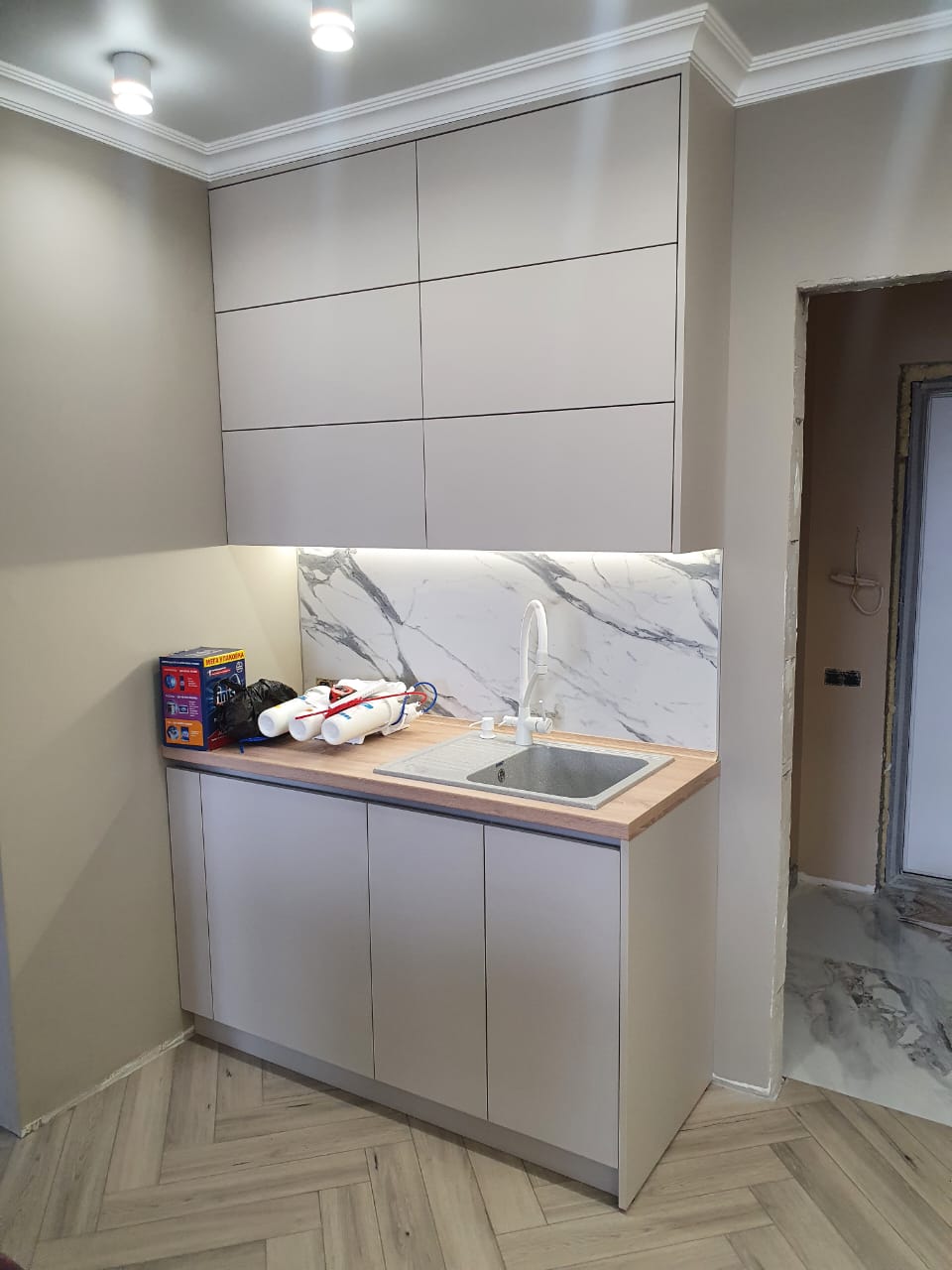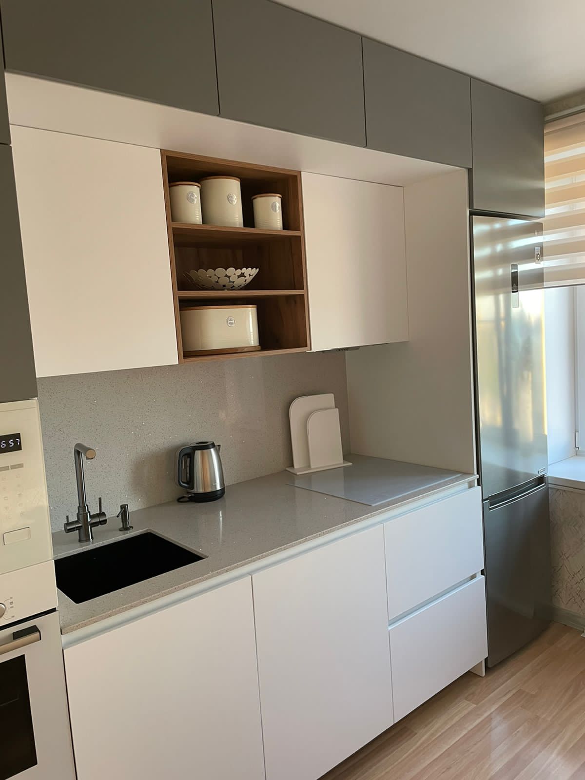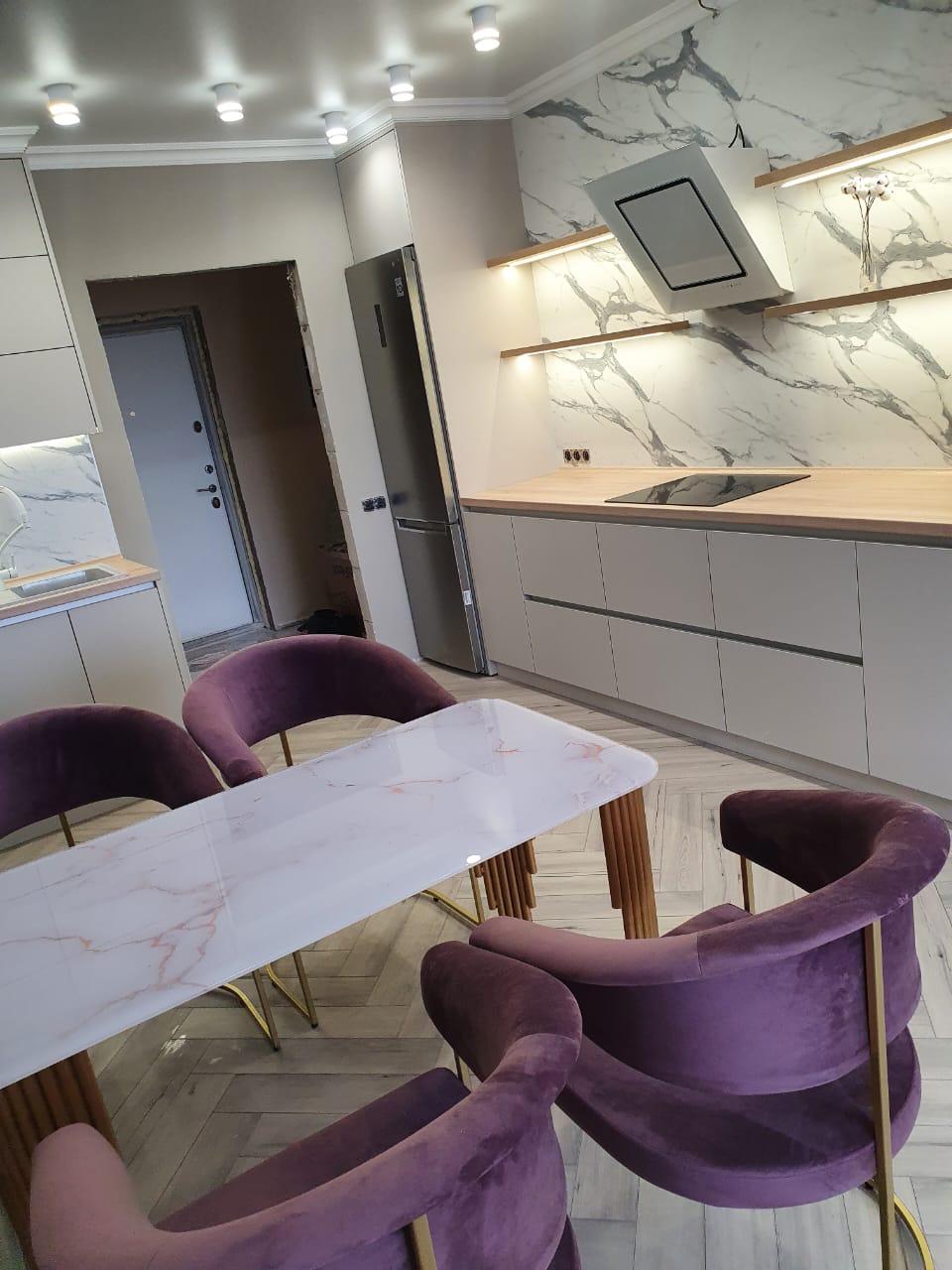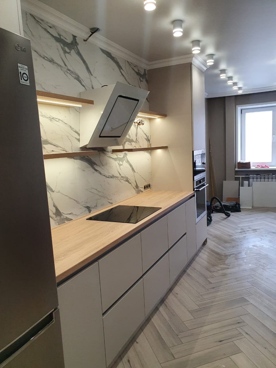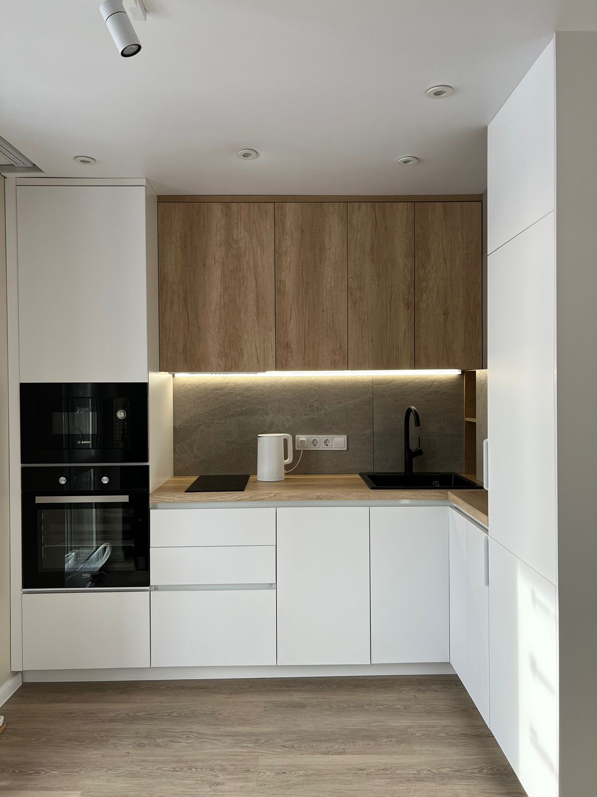 Современная кухня с белыми матовыми фасадами