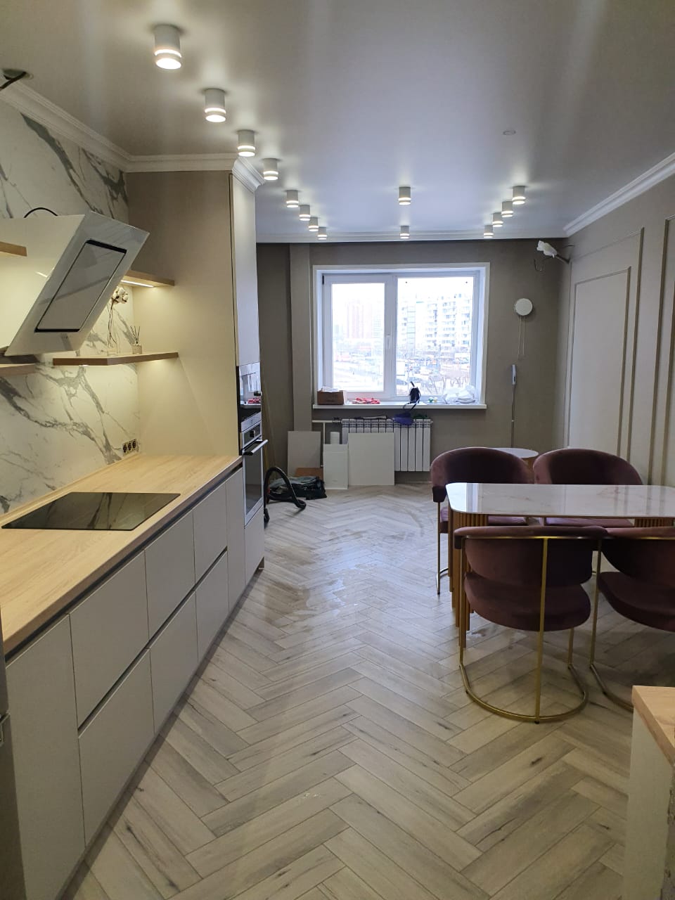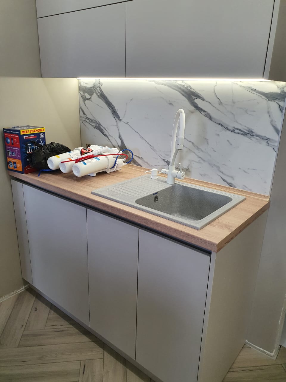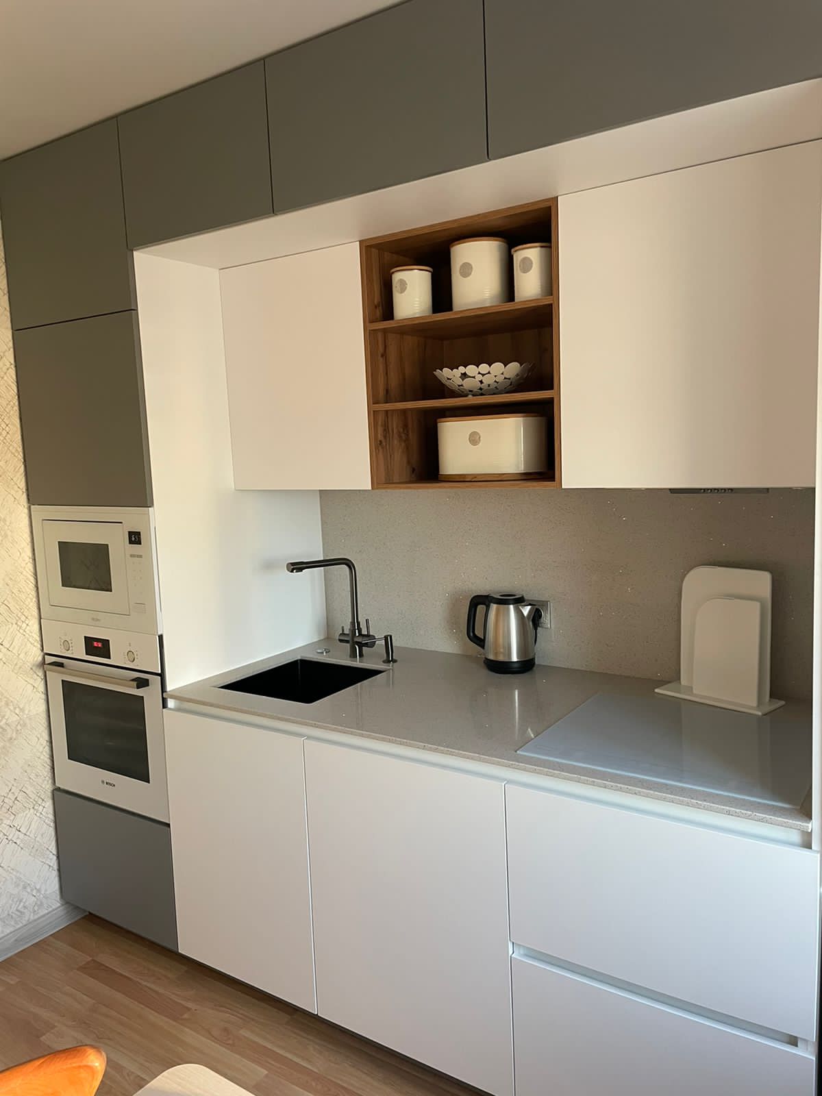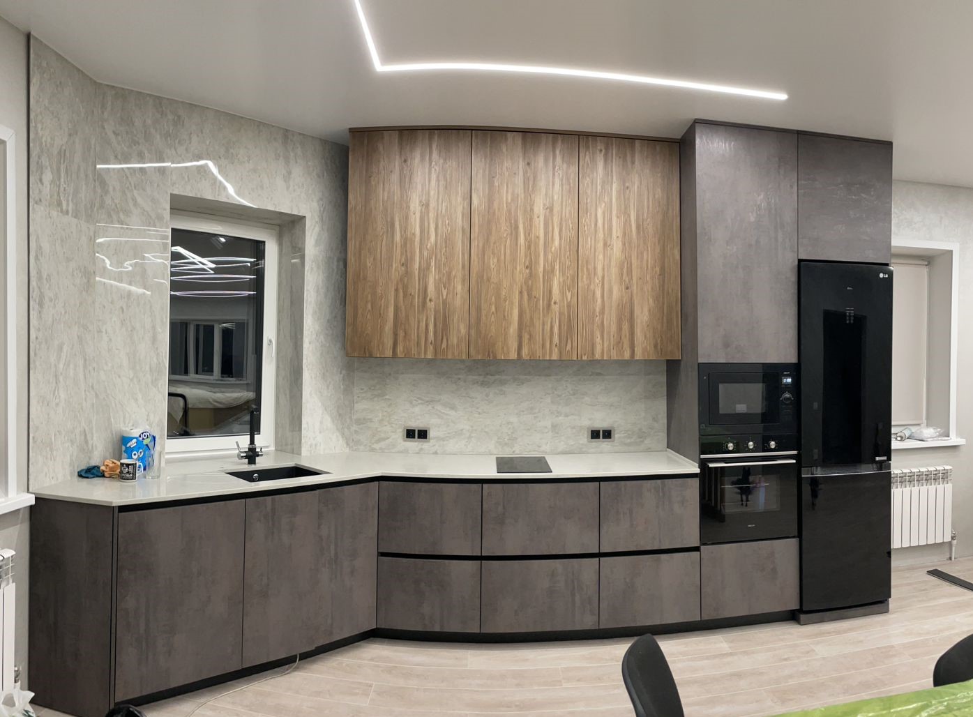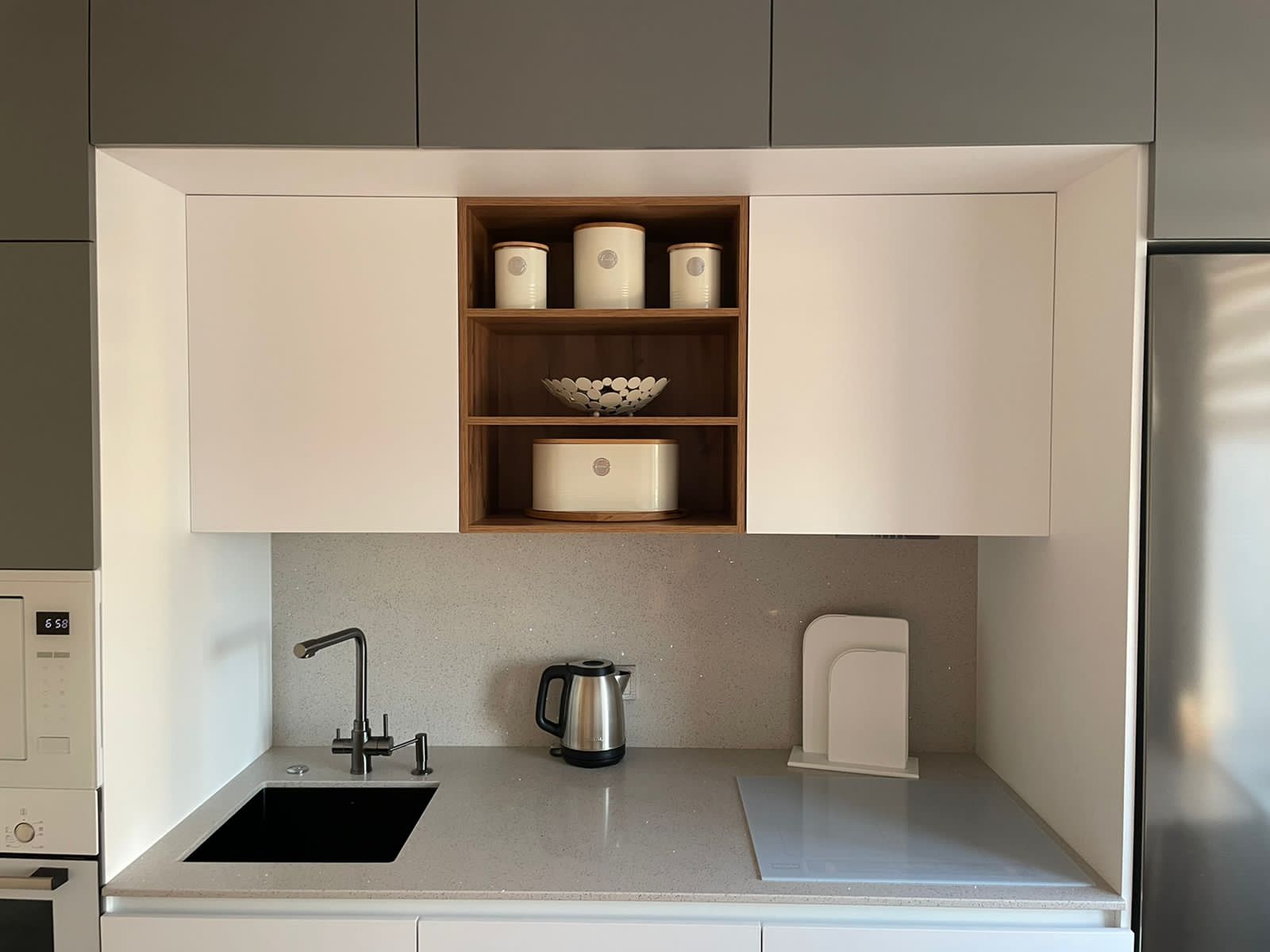 Современная кухня с белыми матовыми фасадами